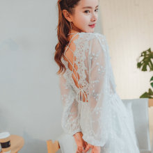 2017夏季韩国a字裙学生小清新白裙蕾丝长袖裙子夏天连衣裙中长款