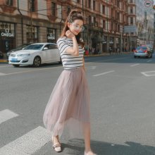 2017新款百褶中腰网纱半身裙中长款女春显瘦修身蓬蓬甜美裙