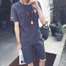 短袖套装男夏季 仿亚麻T恤男士大码日系宽松体恤青年休闲运动套装
