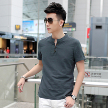 男士短袖T恤 v领纯色体恤亚麻棉麻潮夏季日系宽松韩版半袖上衣服