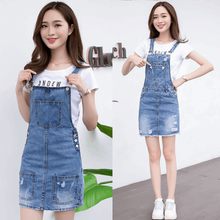 牛仔背带裙女2017新款学院风俏皮学生韩版中长款破洞A字连衣裙夏