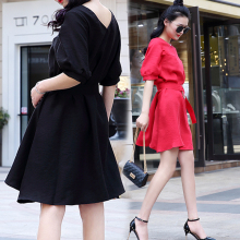 默绣欧洲站2017夏新v领收腰A字裙宽松显瘦棉麻短袖连衣裙女配腰带