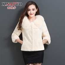 鑫纳多2016冬季新款海宁狐狸毛领皮草外套女短款七分袖獭兔毛修身