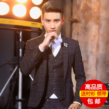 韩版修身休闲西装套装 男格子三件套商务休闲春秋装英伦外套潮流