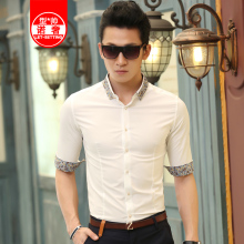 韩版修身纯色薄款 潮男七分袖衬衫 发型师拼接中袖白衬衣男新款