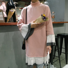 2017春季新款韩版中长款宽松百褶裙摆喇叭袖长袖半高领卫衣连衣裙