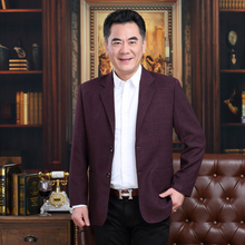 中年小西装男士春秋季西服外套爸爸装宽松酒红格子单西上衣男版薄