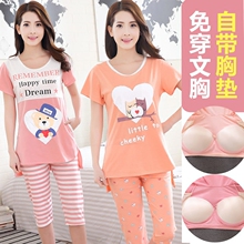 自带胸垫睡衣女夏天纯棉短袖卡通免穿文胸bra一体韩版家居服套装