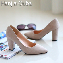 ouba秋季新款粗跟尖头中跟浅口绒面黑色单鞋时尚工作伴娘小码女鞋