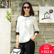 菲妮迪女装春装新款简约时尚套头衫上衣 大码宽松拼接圆领T恤