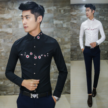 中国风薄款长袖衬衣男韩版修身个性刺绣男士衬衫发型师夜店潮男装