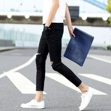 夏季英伦新品黑色破洞九分裤男薄款显瘦九分牛仔裤小脚裤男铅笔裤