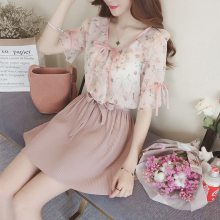 夏季新款柔美碎花雪纺上衣V领五分袖雪纺衫女宽松蝴蝶结短袖衬衫