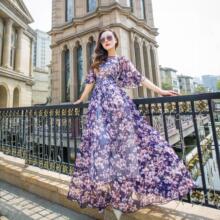 017欧洲站雪纺新款欧美印花连衣裙圆领七分袖大摆裙长款