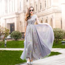 2017春夏装新款复古修身长裙欧美印花连衣裙文艺小立领雪纺沙滩裙