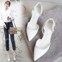 2017春夏新款韩版羊皮细高跟单鞋女时尚珍珠浅口尖头女鞋一字扣带