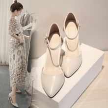 春夏新款韩版中空单鞋女时尚牛皮尖头浅口一字扣带女鞋细高跟鞋子