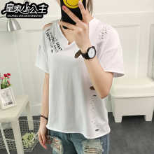 皇家小公主bf宽松破洞短袖t恤女打底衫上衣大码2017学生夏装新款