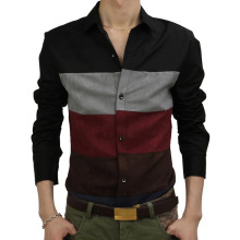 英伦潮男装日韩版春装男士拼接条纹不规则渐变色丝绒修身长袖衬衫