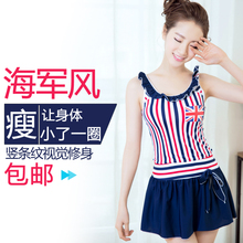 海军风条纹显瘦游泳衣裙式分体女平角裤泳衣学生少女遮肚保守泳装