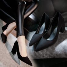 2016春新款粗跟中跟尖头女鞋绒面方跟浅口百搭职业工作女单鞋黑色