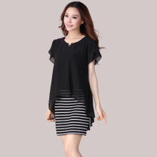 西莉顿2017夏装新款加大码女装 雪纺拼接条纹假两件装胖MM连衣裙