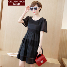 加肥加大码女装2017夏装新款胖mm显瘦短袖雪纺连衣裙蓬蓬A字裙潮