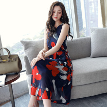秋水哥弟真丝连衣裙女2017夏季大码无袖圆领印花桑蚕丝修身裙子潮