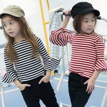 2017春季新款女童中大小童亲子款喇叭袖条纹长袖螺纹棉T恤打底衫
