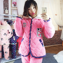睡衣女冬季夹棉加厚三层珊瑚绒女士冬天法兰绒棉袄保暖家居服套装