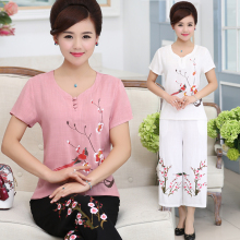 中老年女装夏装套装妈妈装夏季短袖t恤绣花上衣棉麻两件套七分裤