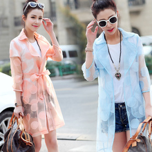 2017年春季POLO领收腰修身七分袖印花系带中长款大翻领防晒衣