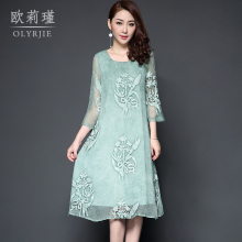 欧莉瑾女装春夏2017新款重工刺绣大码宽松真丝桑蚕丝连衣裙中长款