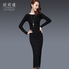 欧莉瑾2016秋冬新款欧美一字领长袖针织打底裙长款修身长裙连衣裙