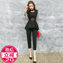 2017春季新款时尚套装裤女荷叶边下摆翻领马甲+修身小脚裤两件套