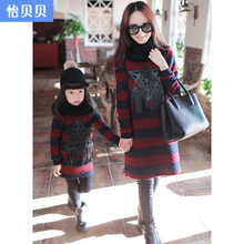 怡贝贝亲子装春装2017新条纹流苏母女装卫衣酒红色女童连衣裙
