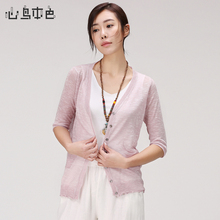 夏季V领开衫针织防晒衣薄款七分袖竹节麻上衣女文艺范宽松外套潮