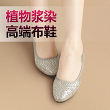 老北京布鞋女尖头春秋步源轩平跟镶钻女浅口中年平底休闲妈妈单鞋