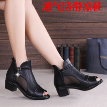 夏季新款女真皮镂空鱼嘴凉鞋粗跟妈妈网靴中年女低跟网纱凉靴防滑