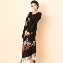 中老年黑色羊毛围巾女 牡丹百合刺绣长款红色围巾披肩送妈妈