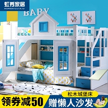 松木子母床高低床儿童上下床两层床实木双层床带梯柜母子床滑梯床