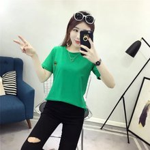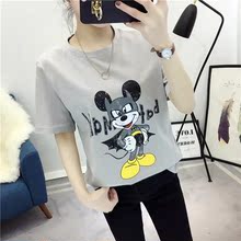 韩版纯色百搭小清新竹节棉图案印花T恤女 圆领宽松纯棉短袖打底衫