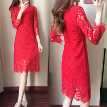2017春装新款女时尚打底裙红色裙子气质长袖中长款修身蕾丝连衣裙