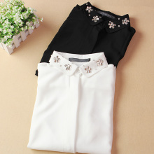 秋装新款韩版手工订珠镶钻娃娃领厚款雪纺长袖衬衫女装打底衬衣
