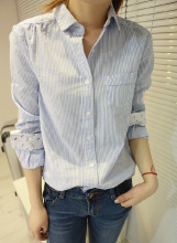 春秋装新款文艺清新浅蓝条纹舒适休闲小翻领长袖衬衫女装衬衣