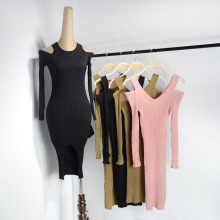 一凡外贸 欧美风 圆领露肩高弹力竖条纹中长款针织连衣裙