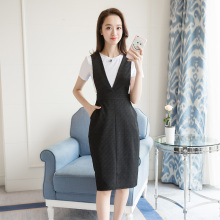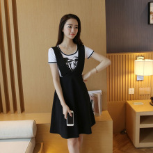韩版收腰背带裙女夏季V领连衣裙A字显瘦雪纺中长裙短袖T恤两件套