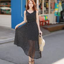 夏季韩版波点雪纺连衣裙修身长裙蝴蝶结吊带收腰仙女裙沙滩裙女