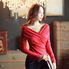 2016韩国新款时尚长袖女装T恤针织打底衫性感V领褶皱修身显瘦上衣
