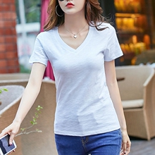 气质竹节棉V领女半袖夏简约休闲百搭纯棉大码白色修身显瘦短袖T恤